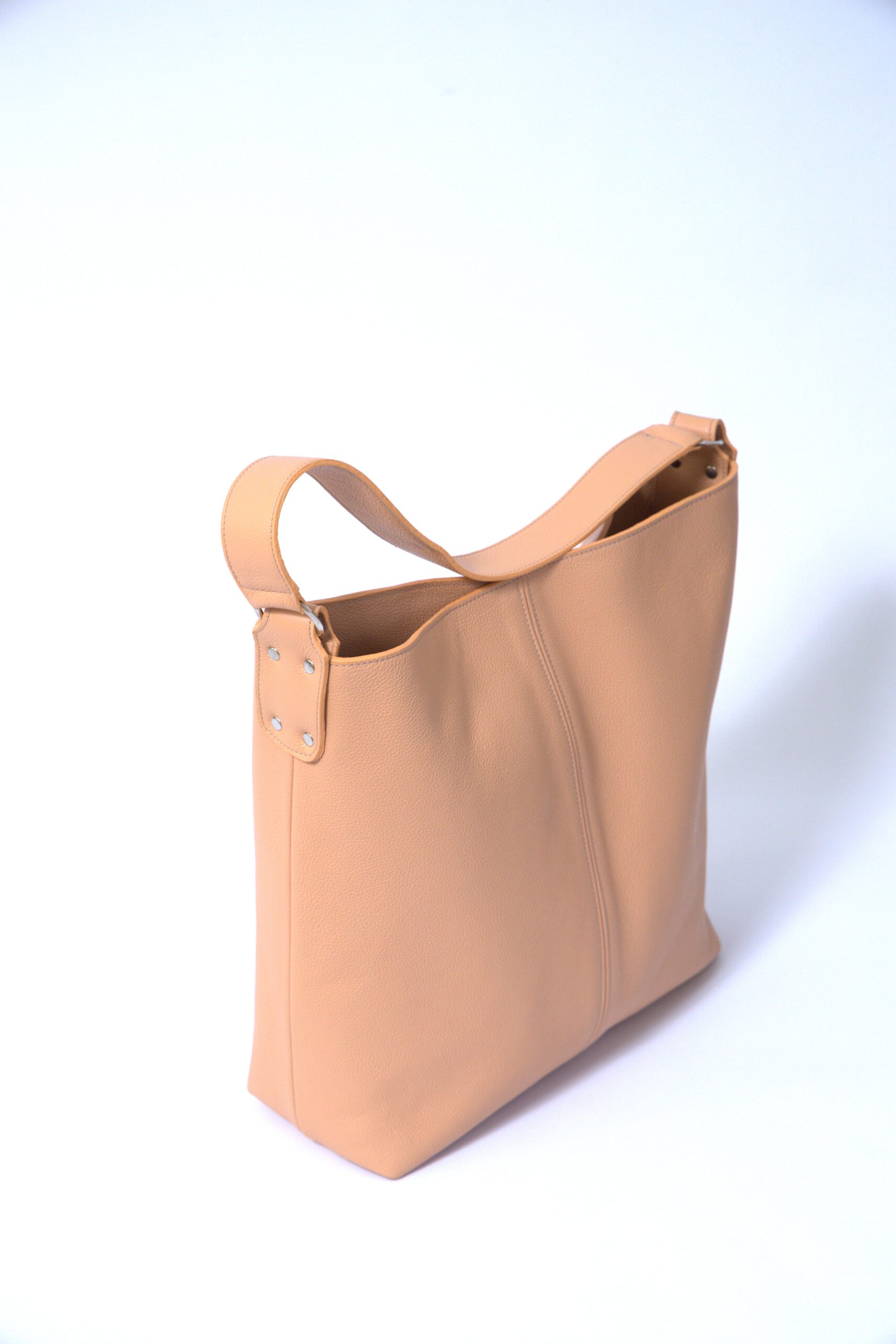 Geanta din piele naturală de dimensiuni mari cu o singură bareta fixată lateral cu inele metalice. Poate completa o ținută office sau casual .
